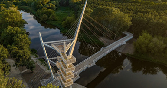 Nowa przeprawa pieszo-rowerowa nad Wartą z wieżą widokową i dwoma platformami na wysokości ok. 12 m i ponad 20 m, z panoramą rzeki i okolicznych lasów.