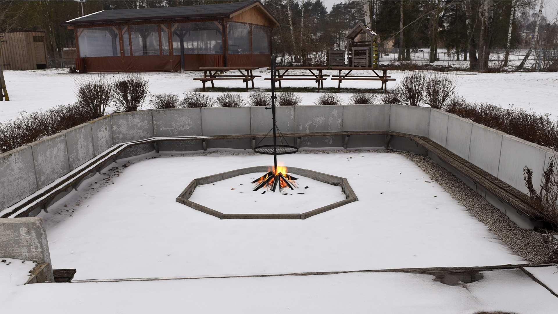 Pięknie wkomponowana w krajobraz przestrzeń, położona bezpośrednio przy stawie, osłonięta od wiatru i otoczona przyrodą. Miejsce zostało zaprojektowane z myślą o spokojnych, wieczornych spotkaniach w kameralnej atmosferze. Wiata ogniskowa jest przystosowana dla grup do ok. 25 osób i doskonale sprawdza się jako przestrzeń na: spotkania rodzinne i towarzyskie, integracje firmowe, wieczory panieńskie, przyjęcia urodzinowe i inne kameralne wydarzenia.