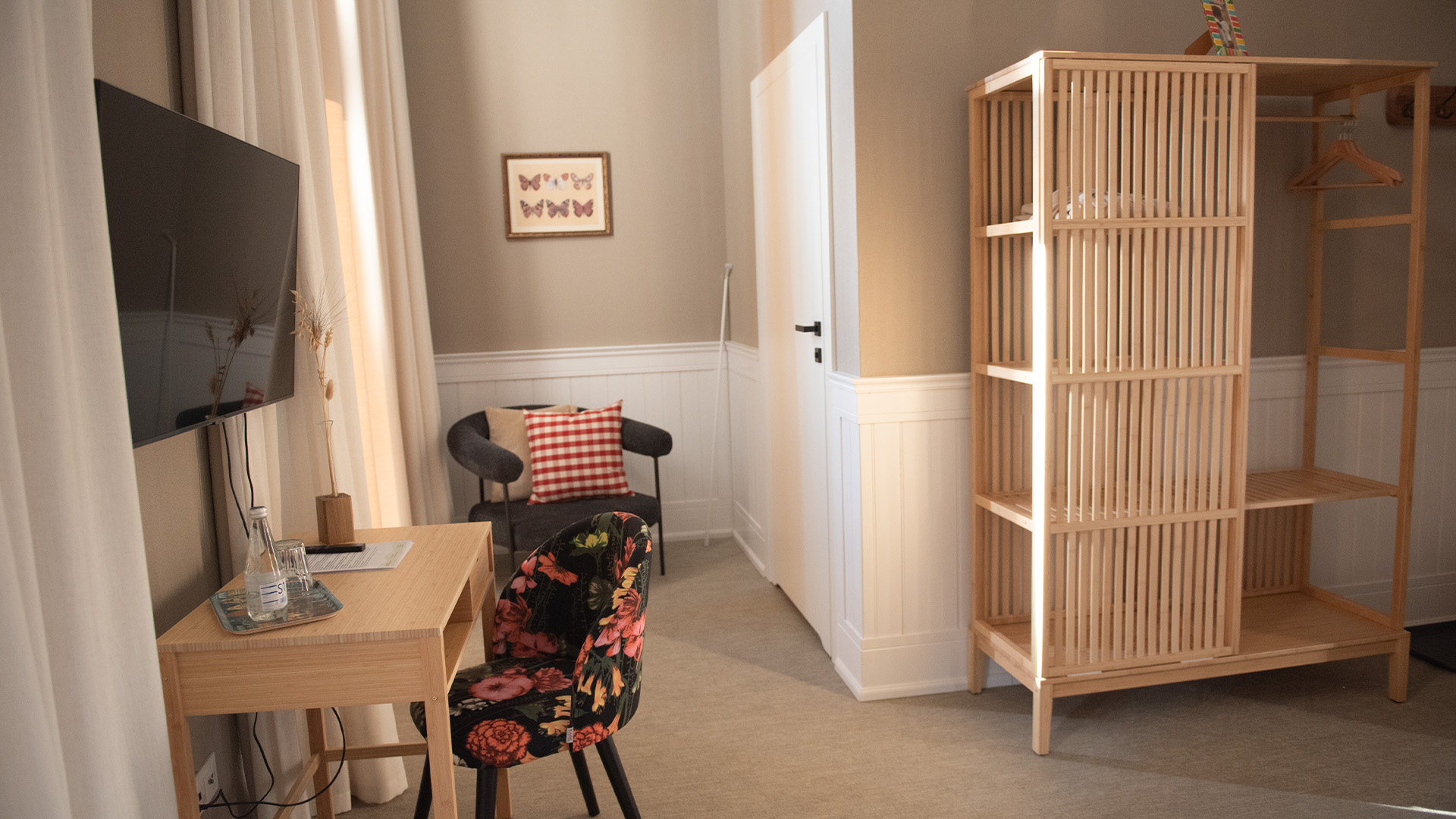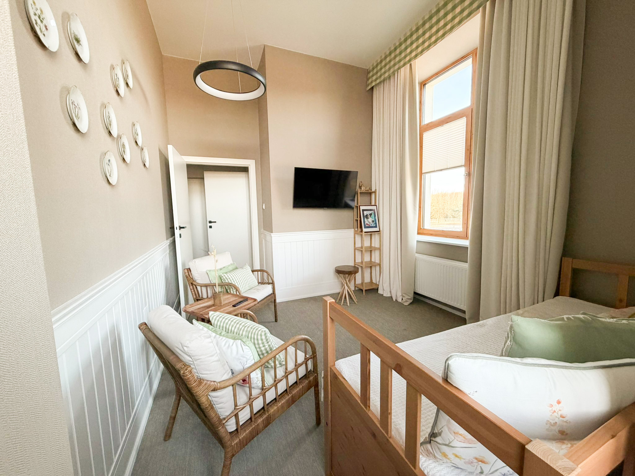 Każdy pokój w Domu Gościnnym jest inny. Nie ma tu powtarzalnych schematów ani identycznych aranżacji. To indywidualnie zaprojektowane wnętrza, tworzone z sercem, starannością i osobistym podejściem.